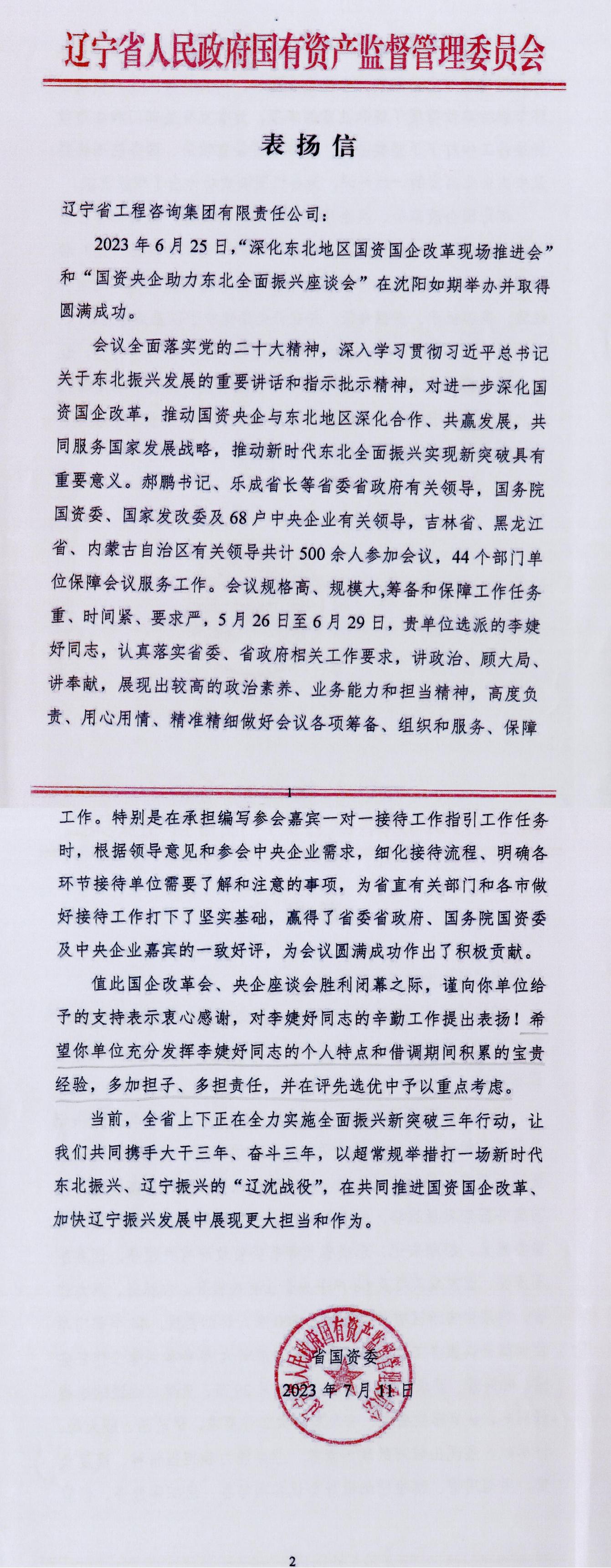 【概要描述】近日,公司選派李婕妤同志代表省工程咨詢集團(tuán)參加“”會(huì)和“”會(huì)的籌備組織和服務(wù)保障工作。工作期間該同志展現(xiàn)出較高的政治素質(zhì)和業(yè)務(wù)素養(yǎng),高質(zhì)量完成了借調(diào)任務(wù),贏得了各級(jí)領(lǐng)導(dǎo)和與會(huì)嘉賓的一致好評(píng)。